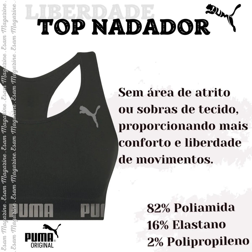O Top Fitness PUMA Original Feminino – Alta Sustentação Nadador Sem Costura (27070) foi desenvolvido para mulheres que buscam conforto, sustentação e liberdade total de movimentos durante os treinos ou no dia a dia.